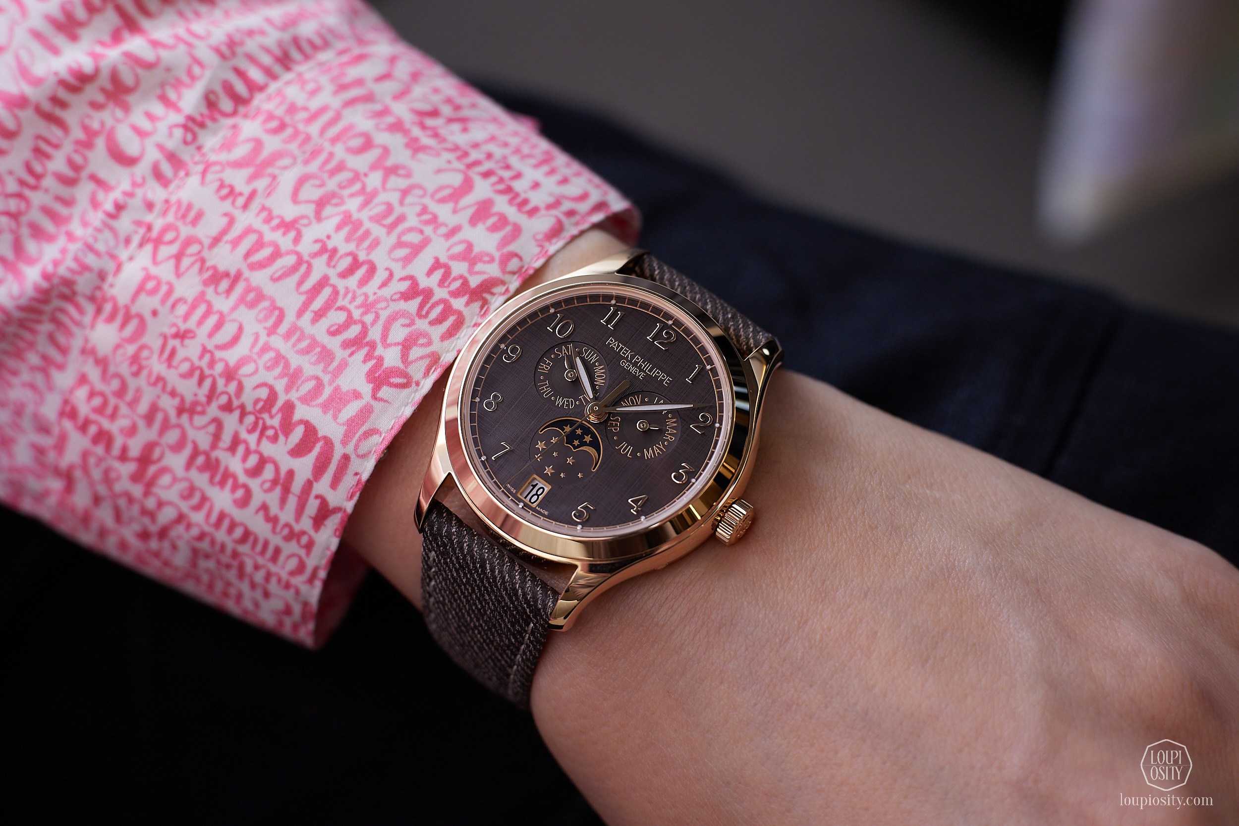 The same ‘shantung’ finishing pattern looks at us on the chestnut brown dial of the 4946R-010. Although its diameter is 2mm larger than the 7340/1R’s, the 38mm model equally targets narrower wrists and people with aesthetic preference for smaller diameters. The metal of the case is the same warm rose gold.