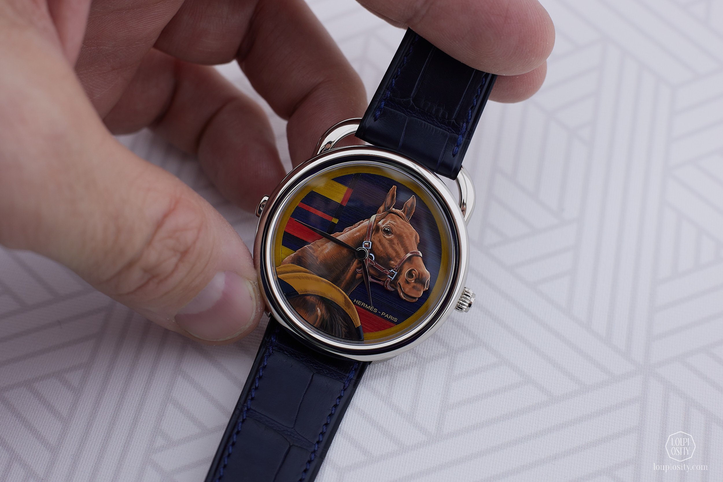 Launched in 2011, the ‘Time suspended’ or Le Temps Suspendu complication is Hermès’ way to pause the time on demand.’ By the press of a button, the watch hides the hour and minute hands under the 12 o’clock position, creating the illusion that time has stopped. Of course, the movement continues running in the background, ensuring accurate timekeeping. With another push, you can resume the time. The complication was developed in collaboration with Jean-Marc Wiederrecht of Agenhor, a renowned Swiss master watchmaker.