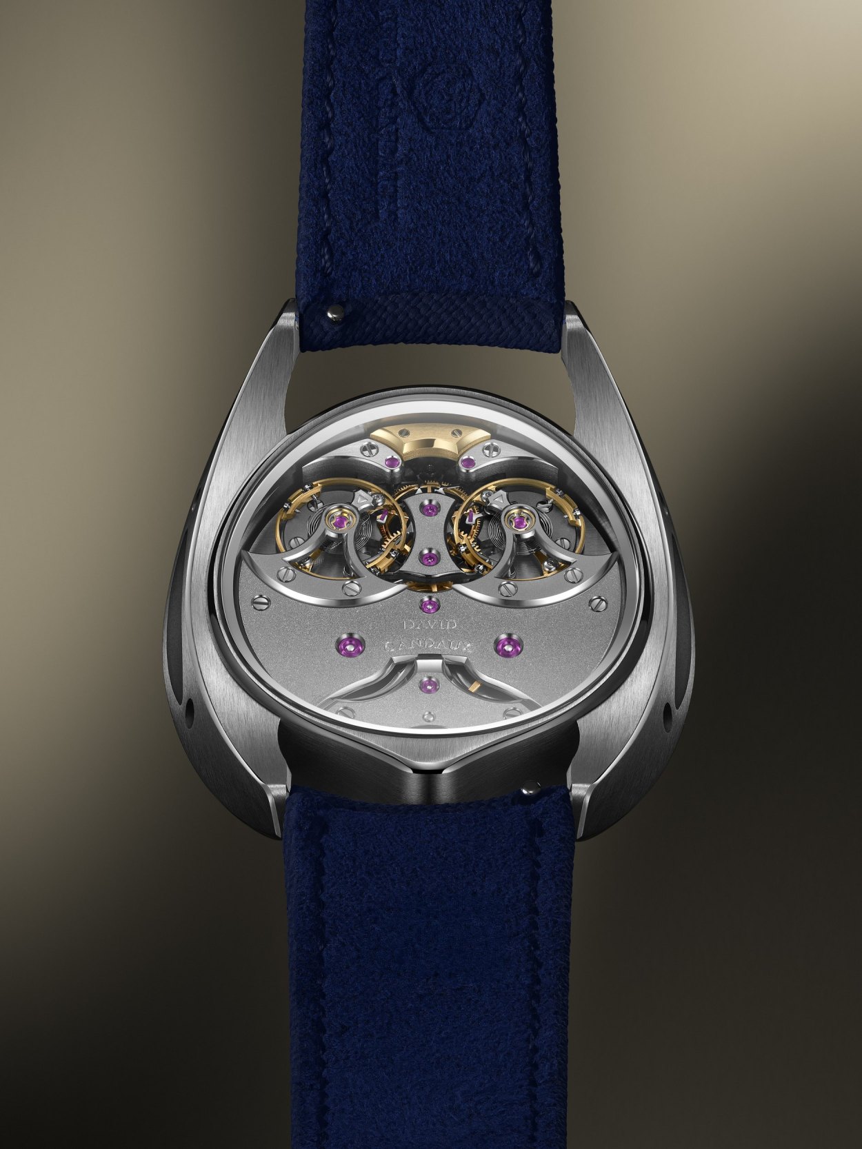 The double‑balance has haunted horologists since the 1930s, when the École Technique de la Vallée de Joux experimented with twin regulators linked by a differential. Philippe Dufour later revived the idea with his Duality and in the DC12 MaveriK, Candaux works on the concept further. Two balances operate independently, each with its own escapement, while a centrally‑mounted flying‑satellite planetary sits on a hairspring shock absorber at the heart of the seconds’ train. The satellite cushions, absorbs, and continuously recalibrates the equilibrium between the balances.