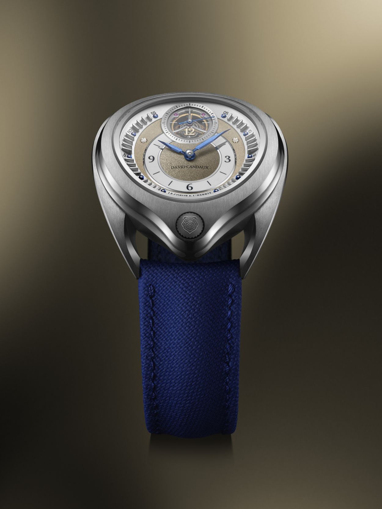 Following the spirit of his previous models, the 39.5mm titanium case is a study in asymmetry and balance. Its top‑loading construction, curved side lugs, and satin‑brushed versus polished surfaces create a tactile contrast that mirrors the dual nature of the movement inside. The “chip‑shaped” dial, crafted from nickel‑silver, unfurls like a leaf caught in a mountain breeze. Its white‑opal central hour disc is encircled by diamond‑polished rings.