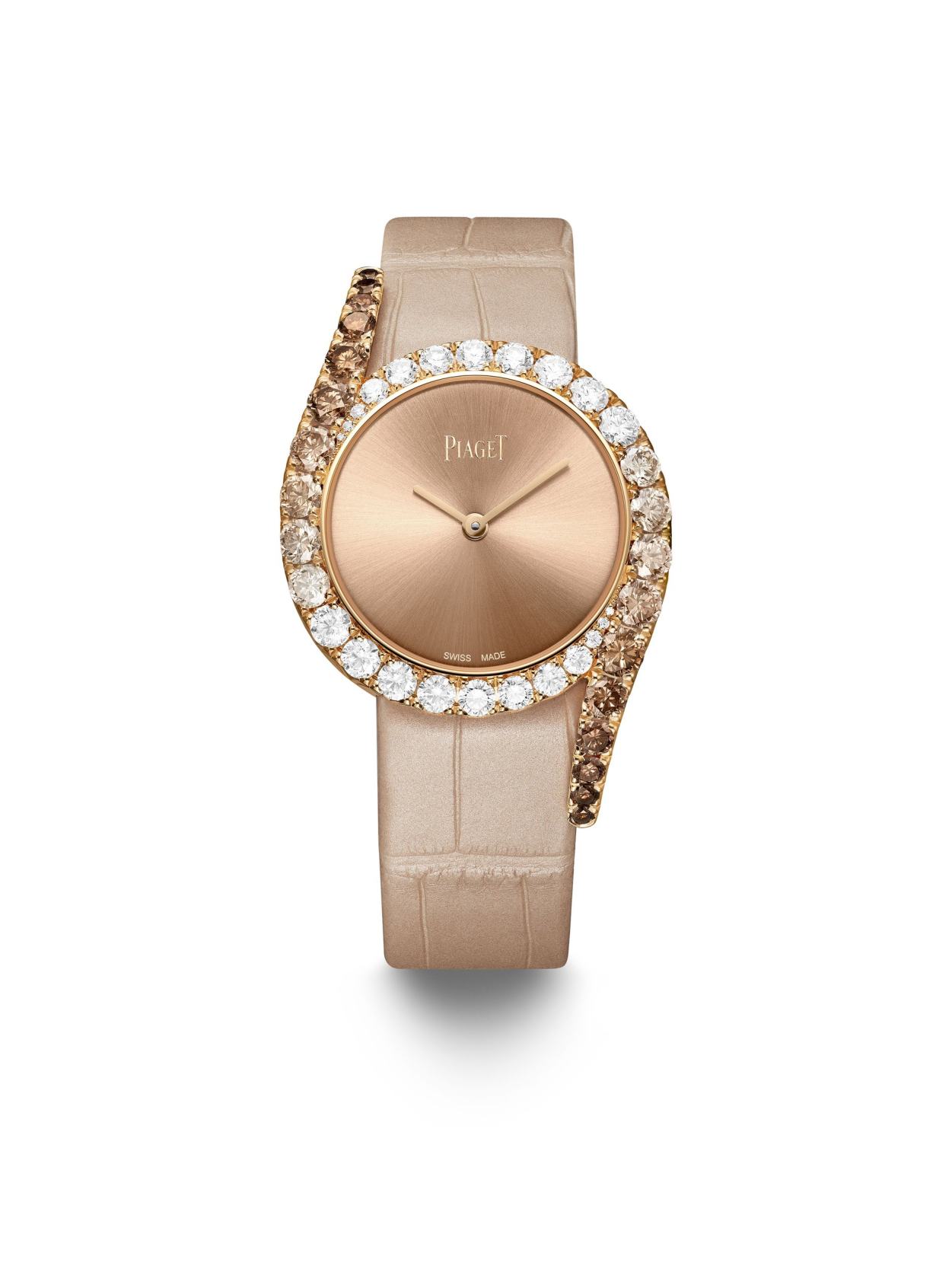 The second timepiece showcases Piaget’s famous Décor Palace engraving technique on the subtle rose gold of bracelet and dial, surrounded by different shades of cognac diamonds. On both models, the subtle dégradé composition and setting of the stones, the spessartite garnets and the white and cognac diamonds, are the result of intricate work, requiring time, patience and special expertise.