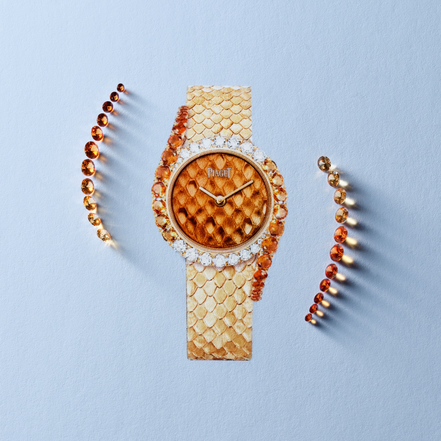 Piaget presents two new gold-engraved version of the Limelight Gala Precious timepiece: a vibrant orange enamel dial over gold engraved to replicate snake-skin and a Decor Palace bracelet, dressed in shades of cognac diamonds.