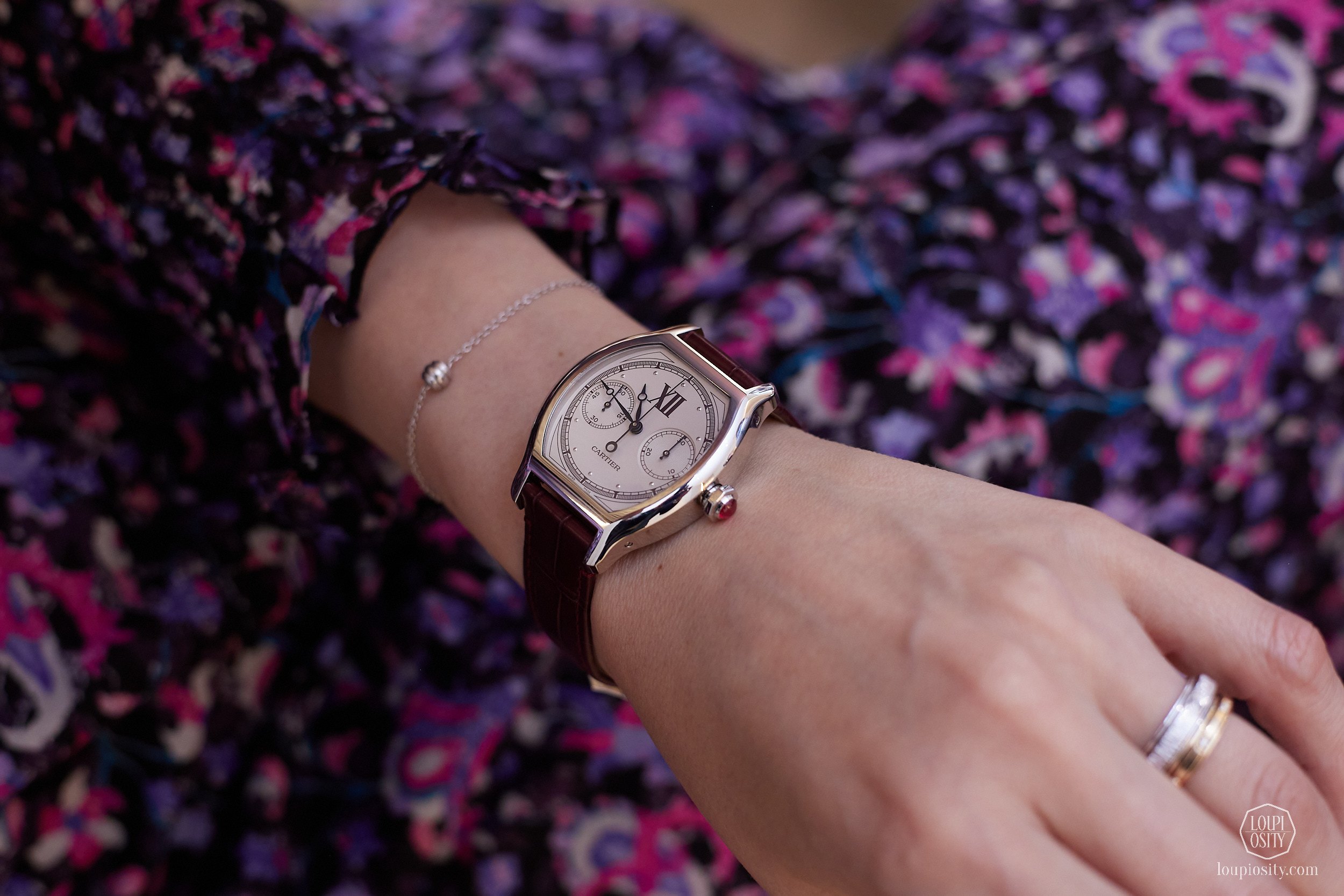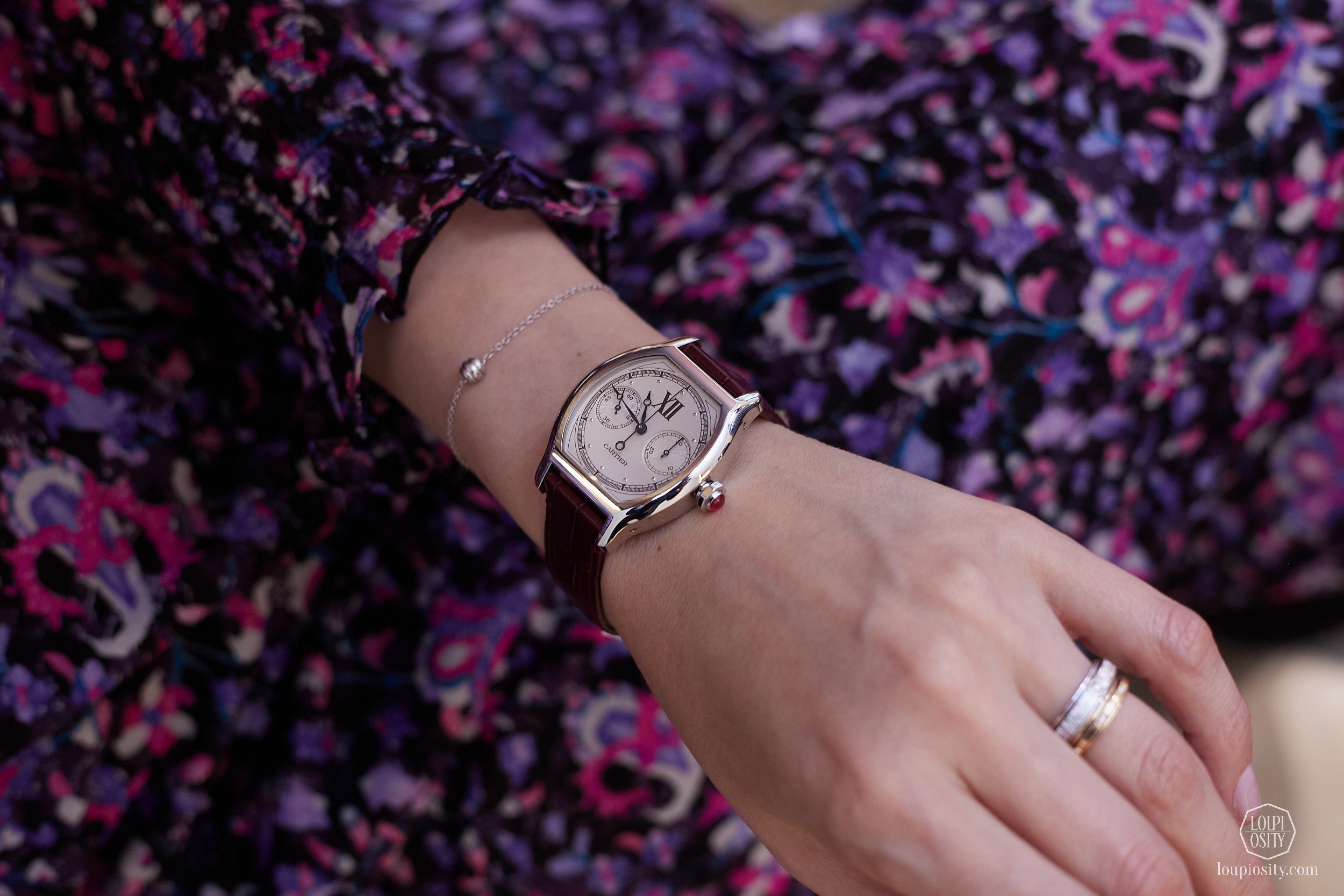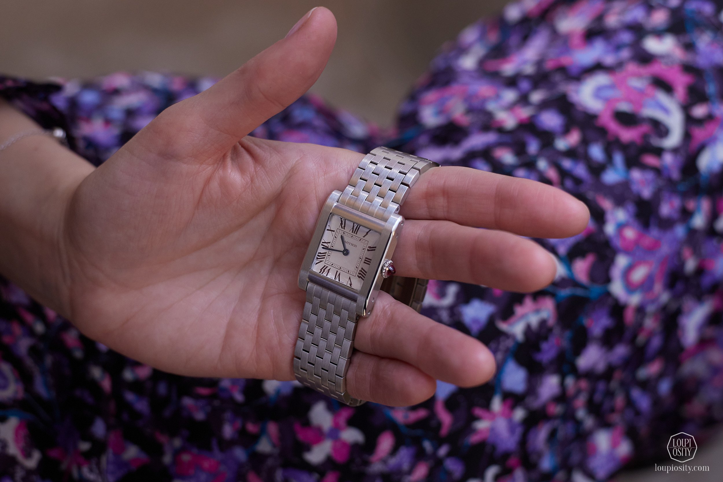The Tank Normale echoes a 1934 model with its seven-row platinum bracelet. The brushed finish on the case and bracelet contrasts with polished edges on the case rim. Silvered opaline dial with burgundy Roman numeral hour markers completes the ensemble.