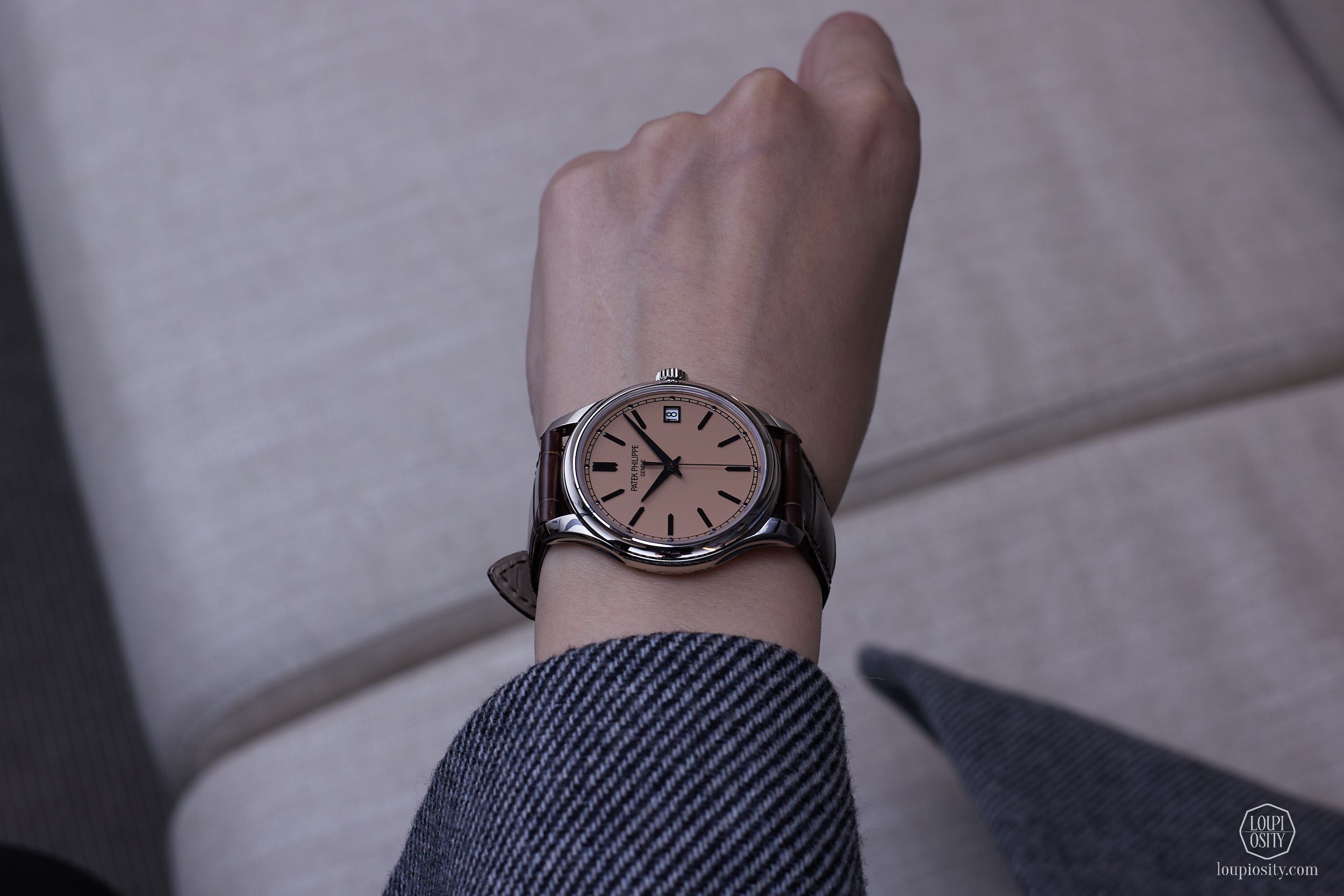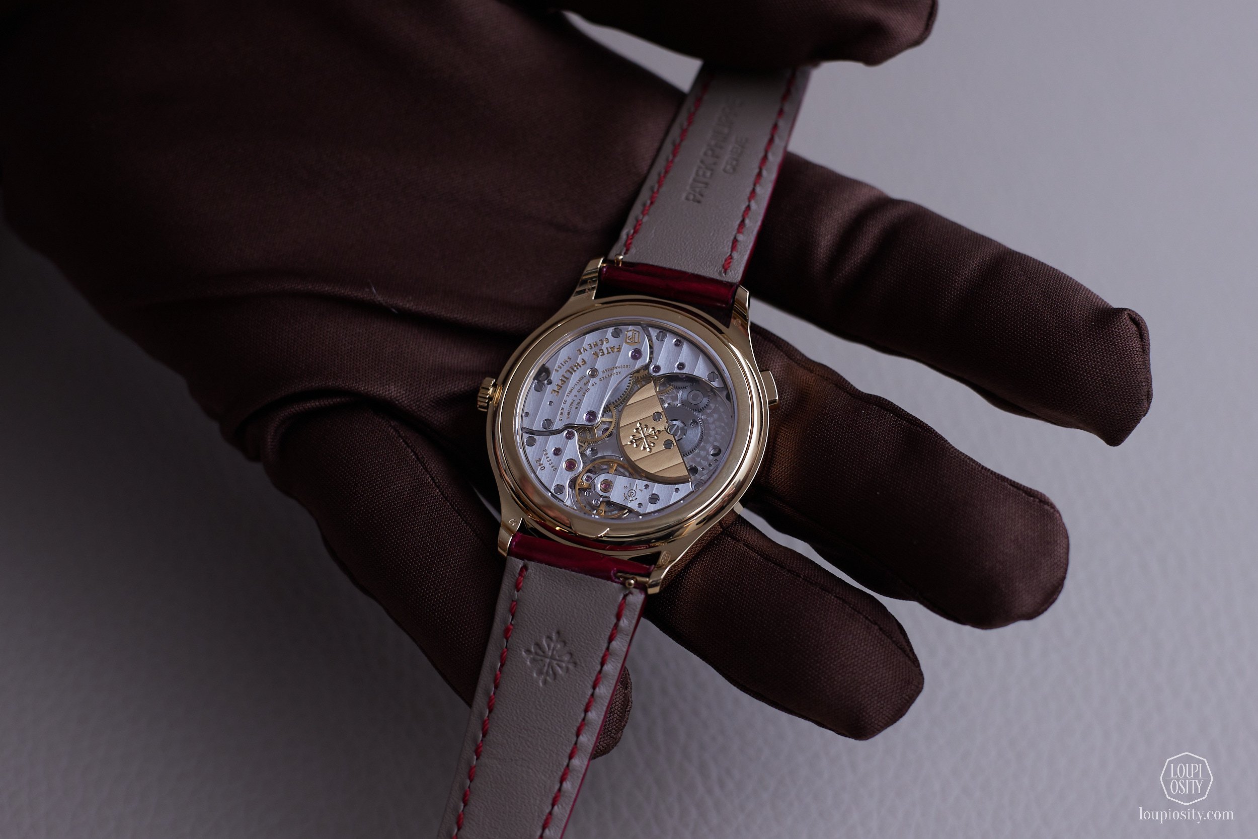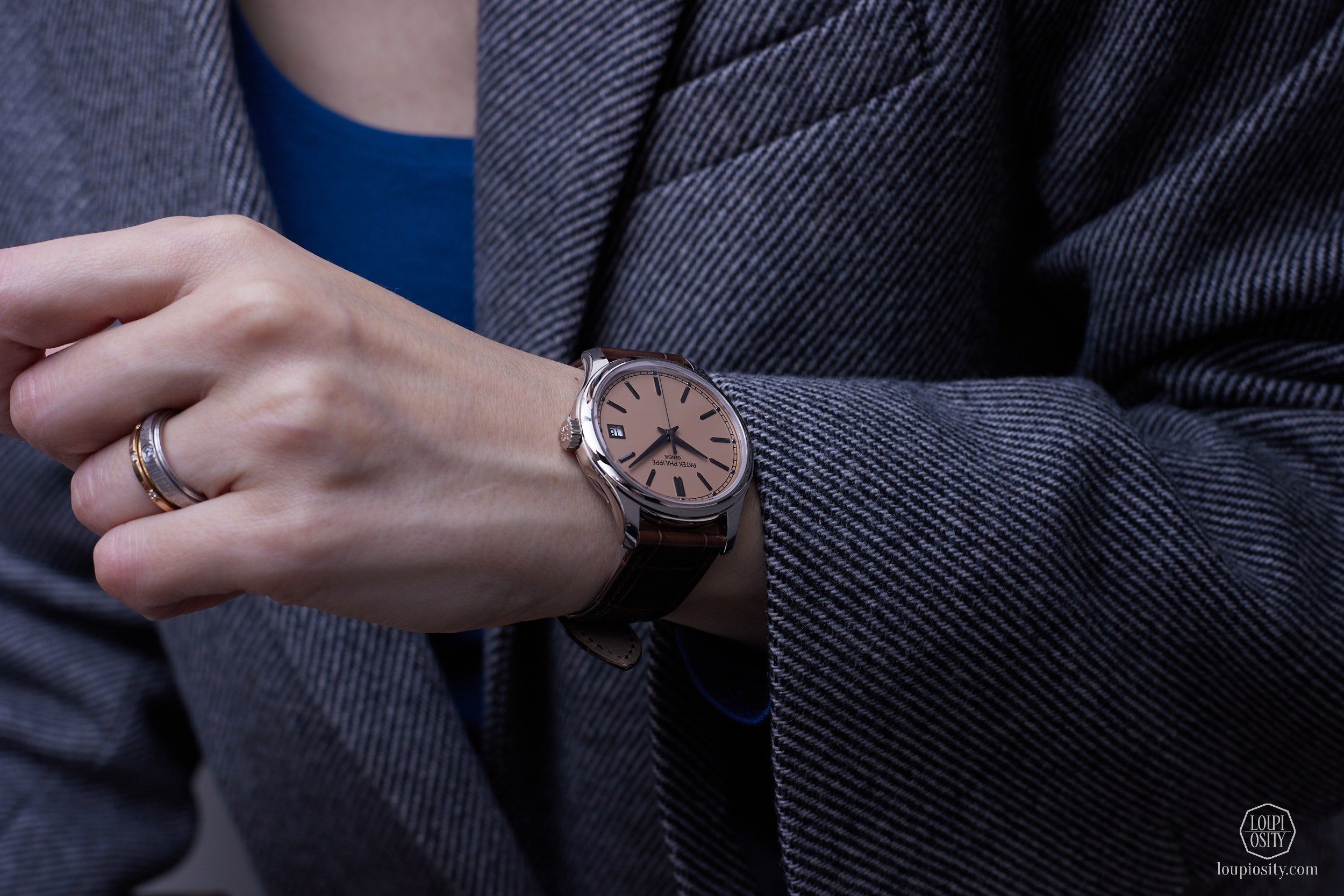 Reference 5227G offers a refined version of the Calatrava, destined for purists who appreciate understated elegance. The watch features a fully polished white gold case with a diameter of 39 mm, a concave bezel, and hollowed, incurved lugs. The “Officer”-style case includes a sapphire-crystal case back protected by an invisibly-hinged dust cover, revealing the caliber 26-330 S C. This self-winding movement features a date in an aperture and a central seconds hand. The dial is crafted from rose-gilt opaline and enriched with applied obus-type hour markers and faceted dauphine hands in charcoal-gray white gold. The watch is completed by an alligator-leather strap in shiny chocolate brown. This model emphasizes the timeless nature of the Calatrava, focusing on the quality of finishing and the integrity of the case construction.