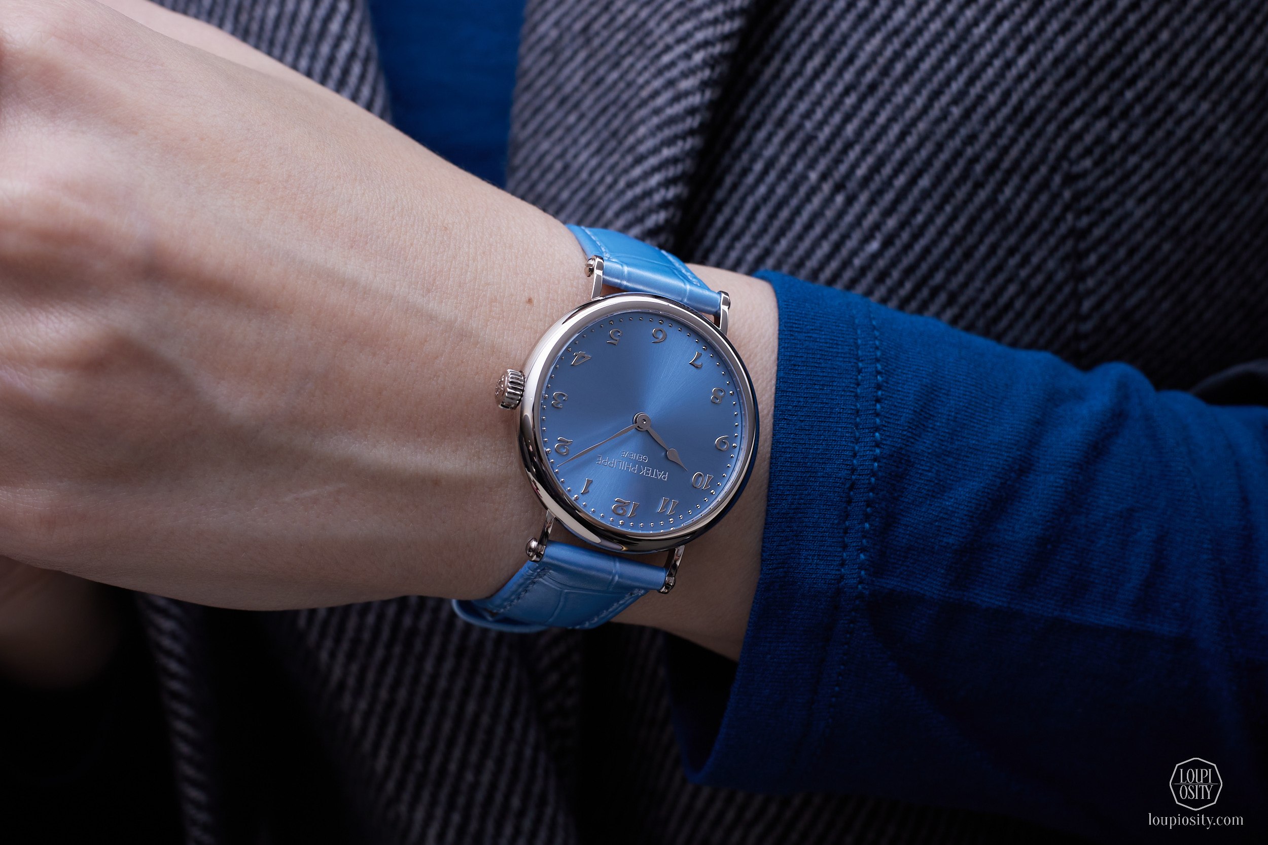 Patek Philippe introduces two solar variations of the Calatrava for women, References 7200/50G-001 and 7200/50G-012. Both models feature a 34.6 mm white gold “Officer”-style case with a thickness of 7.37 mm, achieved through the use of the ultra-thin caliber 240 movement with an off-center 22K gold mini-rotor. Reference 7200/50G-001 features a sand-beige sunburst dial with a matching calfskin strap, while Reference 7200/50G-012 presents an ice-blue sunburst dial paired with a pearlescent ice-blue alligator-leather strap. The dials are adorned with applied Breguet numerals and pear-shaped hands in white gold. These watches highlight the versatility of the Calatrava form, adapting it for a modern audience with a focus on color and texture while maintaining the classic aesthetic of the collection.