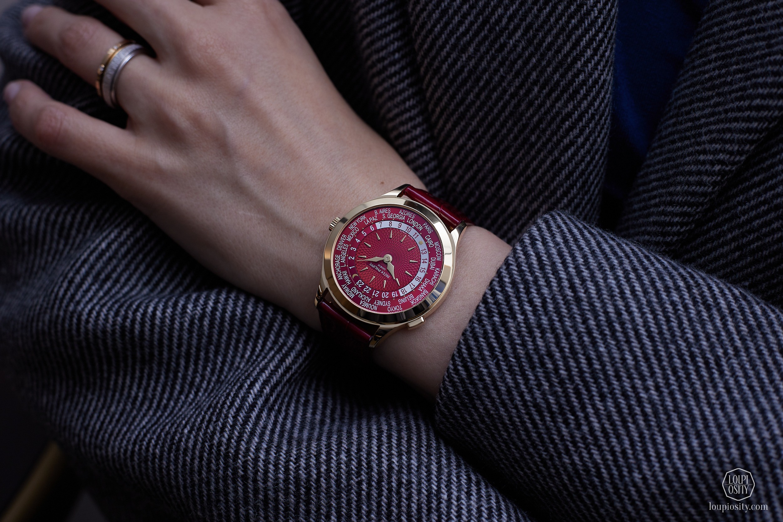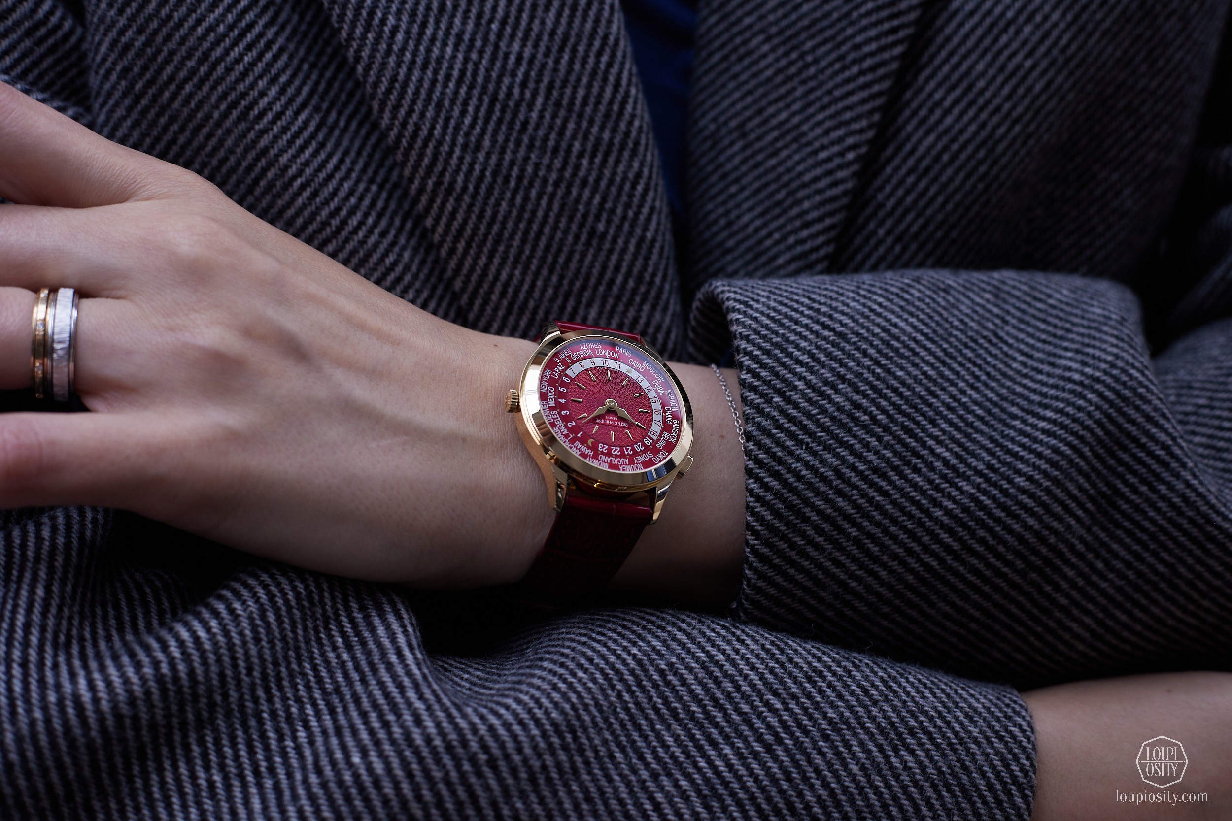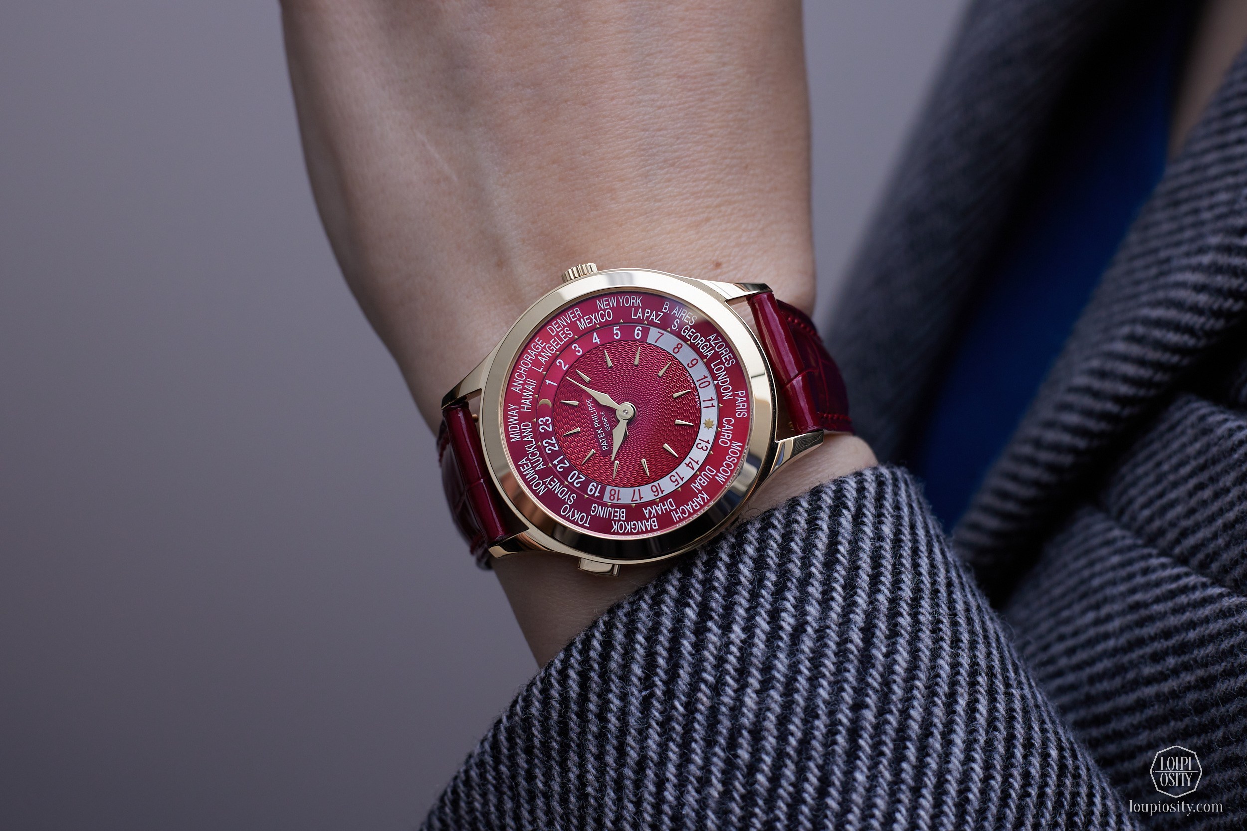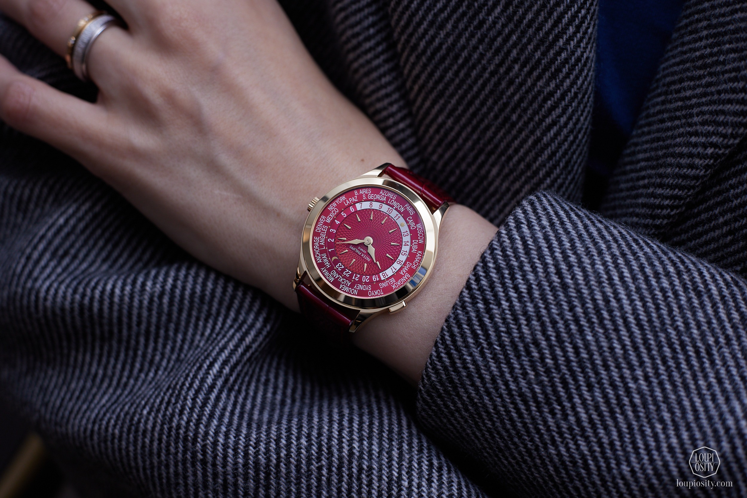 Reference 7129J is a World Time watch that pairs a yellow gold case with a flamboyant carmine-red lacquer dial. The dial is enriched with a hand-executed “vieux panier” (basket weave) guilloché decoration, showcasing the brand’s commitment to rare handcrafts. The watch is powered by the ultra-thin self-winding 240 HU caliber. This mechanism patented in 1999 allows for the simultaneous correction of all time zone displays with a single pressure on the pusher at the ten o’clock position. The design draws on the legacy of Louis Cottier, who invented the World Time mechanism in the 1930s. The movement is the same as in the 5330G from 2024, but the case diameter is reduced from 40mm to 38mm. The combination of the vibrant red lacquer and the traditional guilloché technique creates a striking visual effect, bridging classical craftsmanship with bold modern color choices.