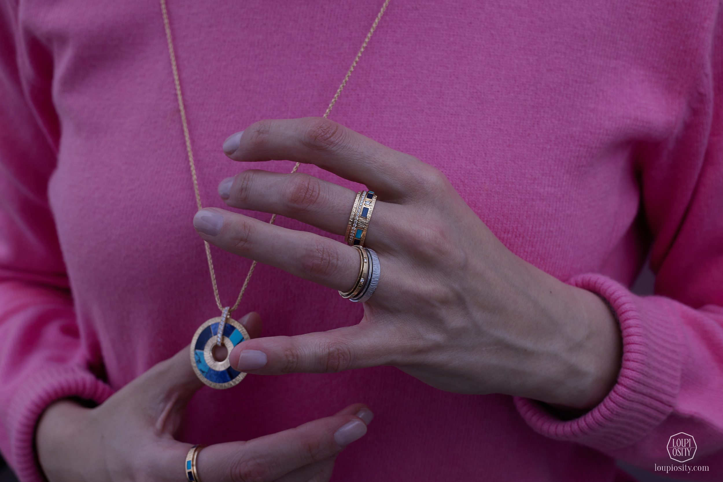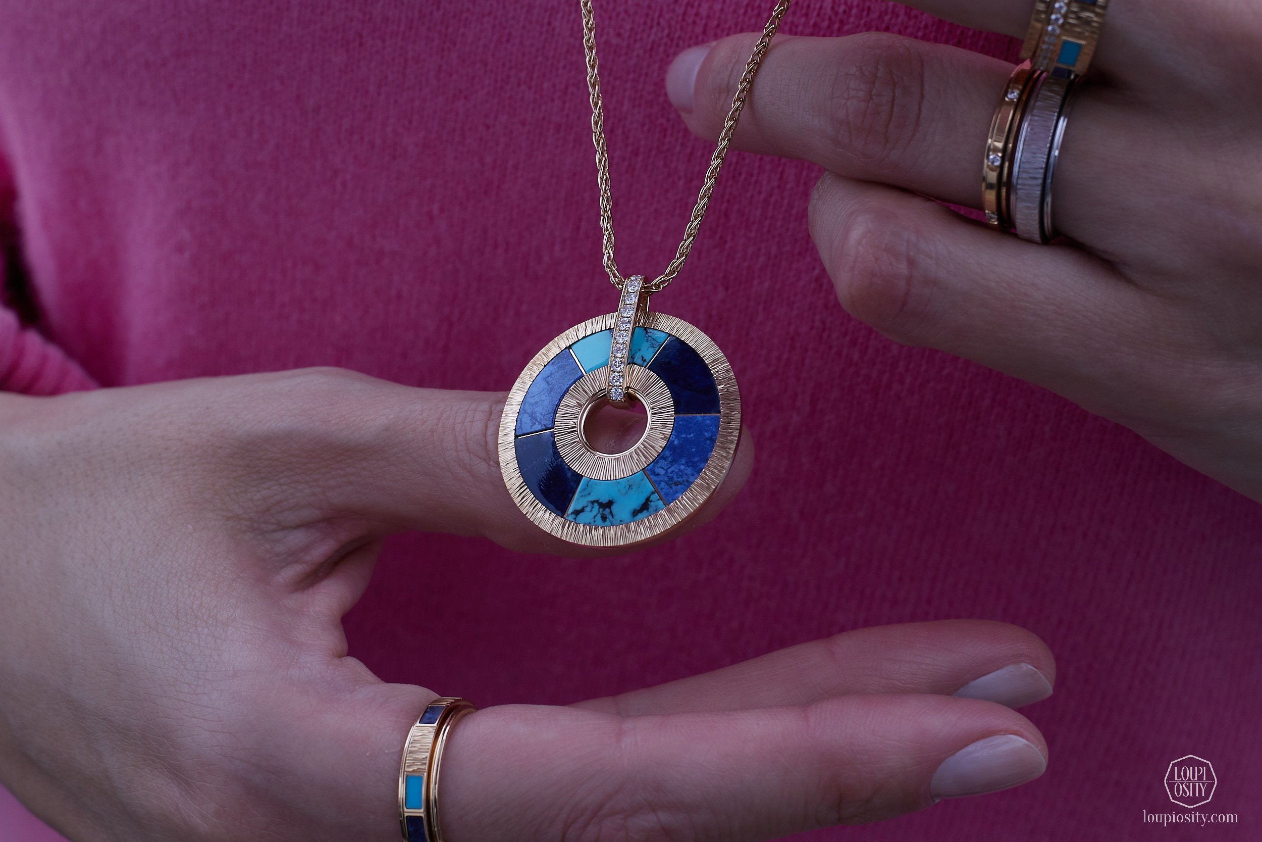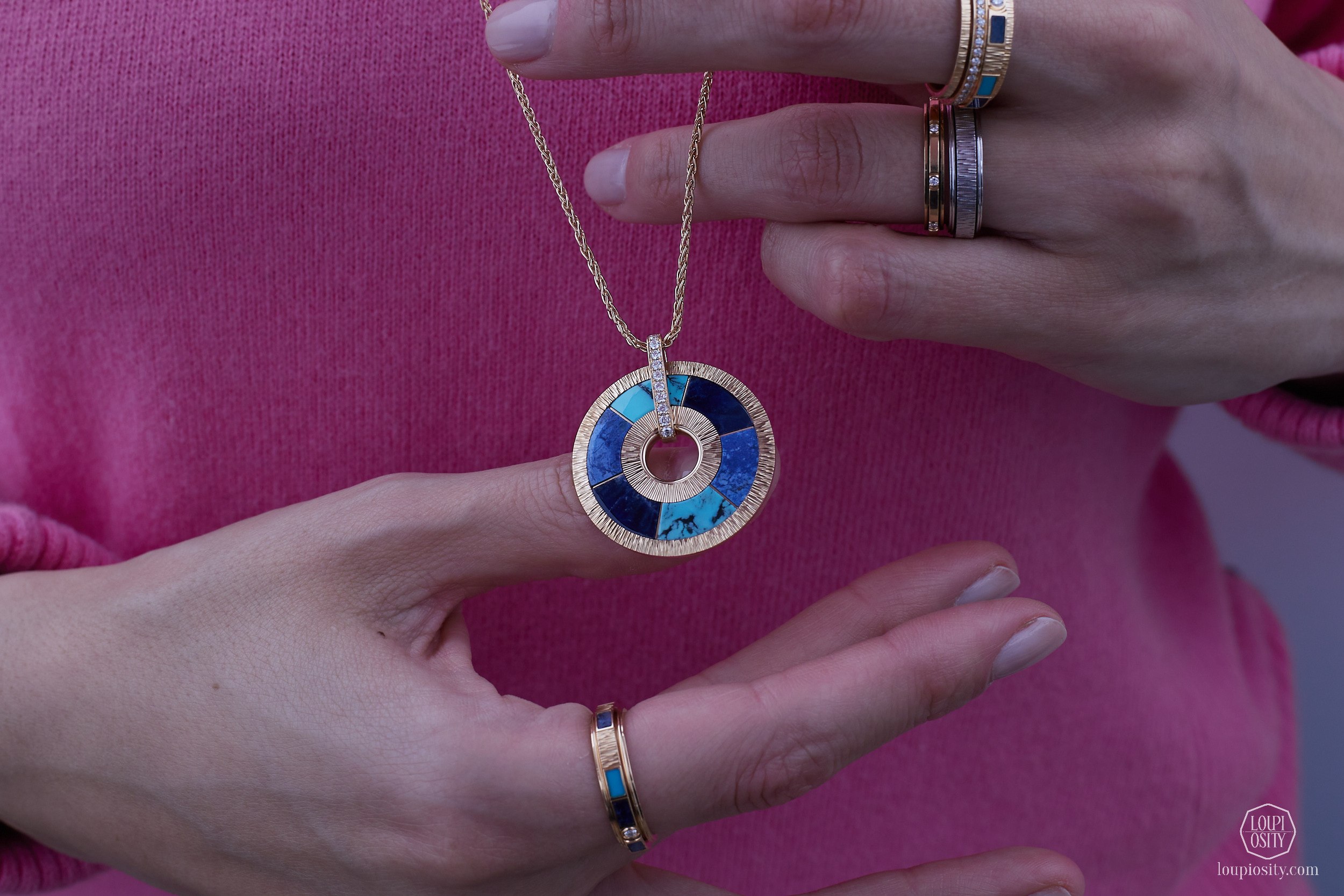 The line includes rings, pendants, earrings, bracelets, and a necklace in 4N pink gold with the hard stone mosaic, half-moon-set diamonds, and the Décor Palace engraving.