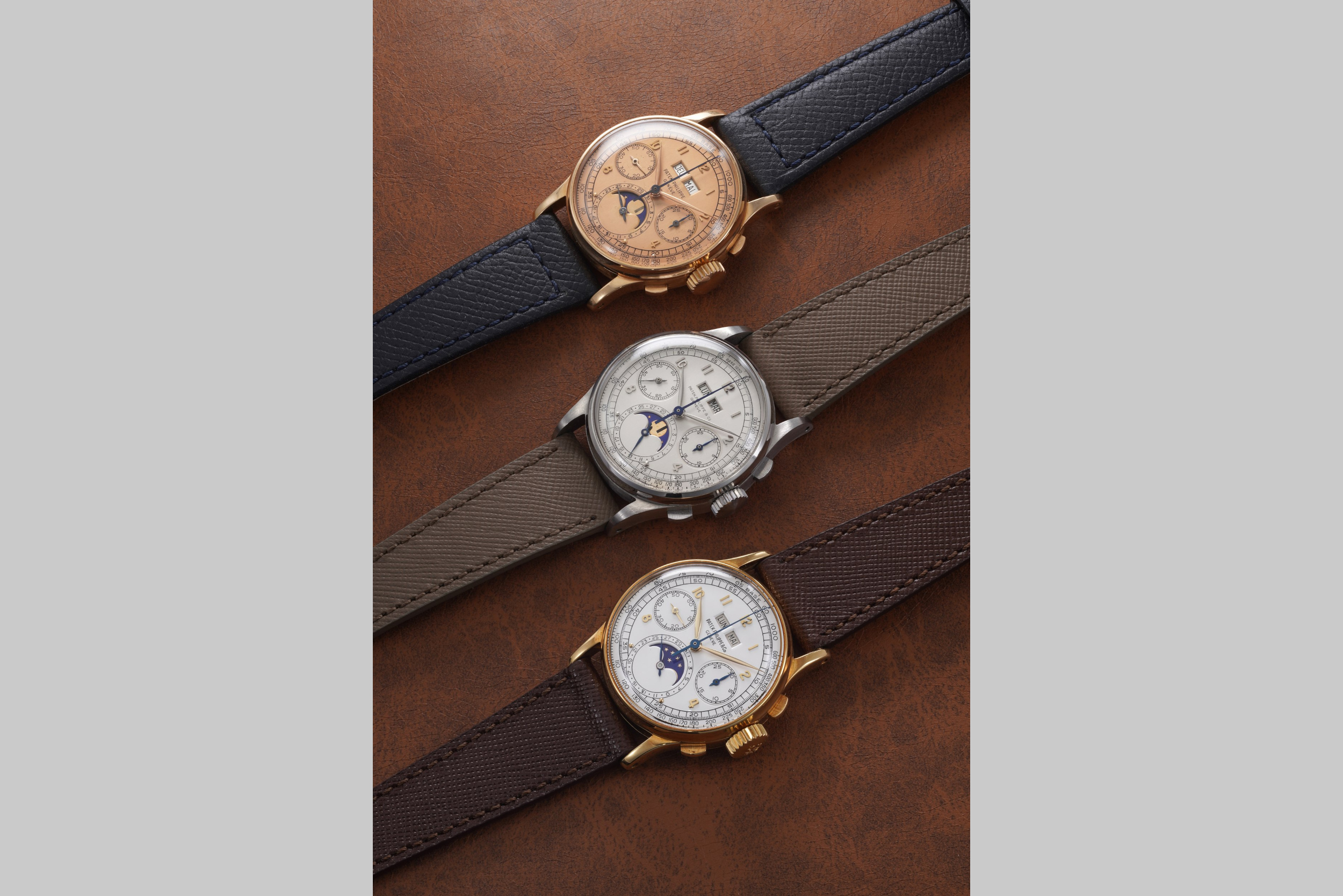 Launched in 1941, the Ref. 1518 set the blueprint for every perpetual calendar chronograph wristwatch that followed. With just 281 made across all metals – and only four known in stainless steel – this trio represents one of the rarest gatherings in watch auction history.