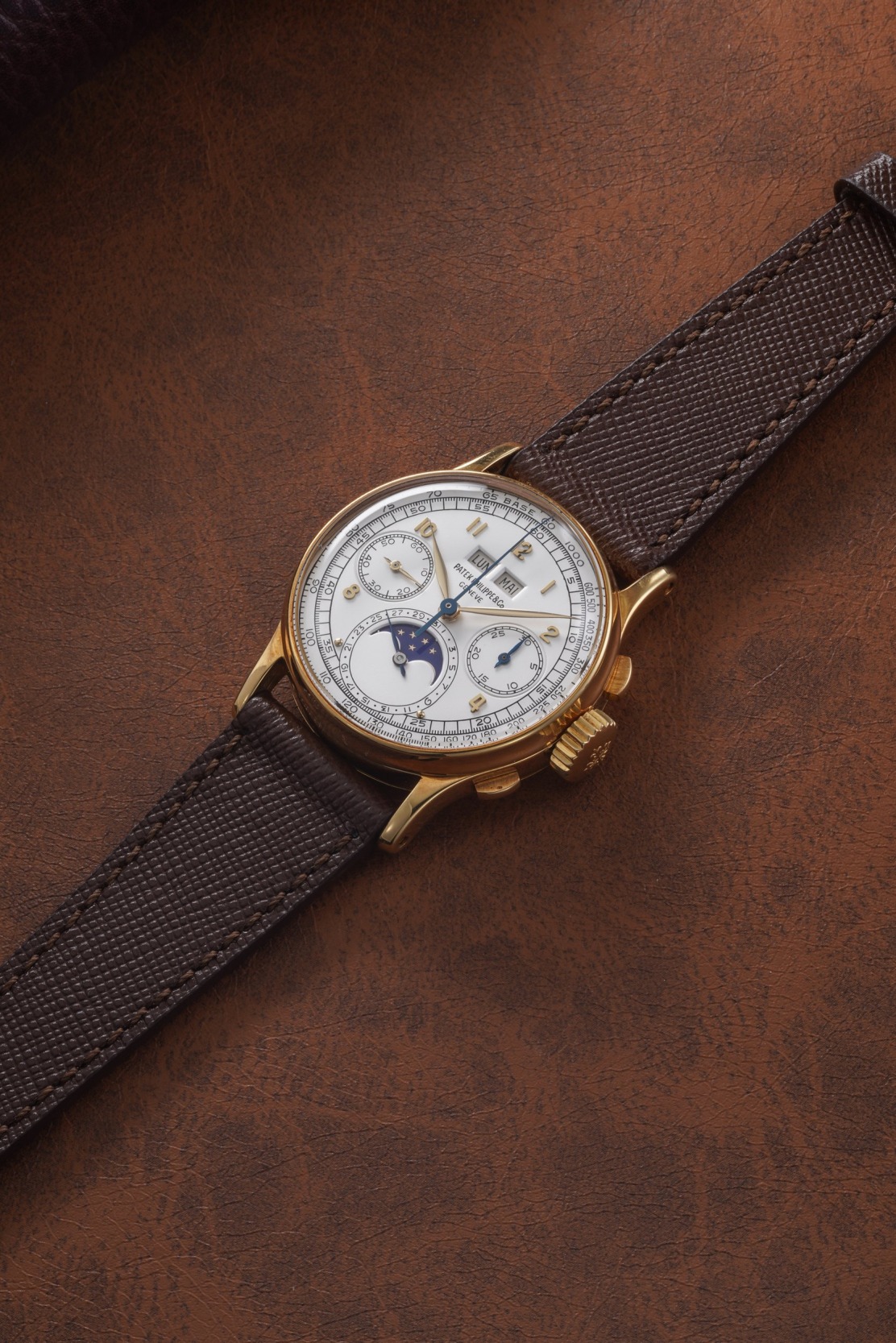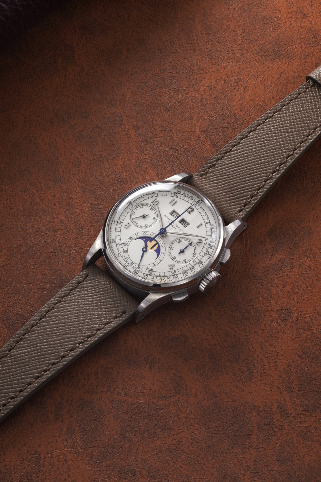 It is the first time, that the stainless steel, pink-on-pink, and yellow gold examples of the world’s first serially produced perpetual calendar chronograph wristwatch will appear in the same auction.